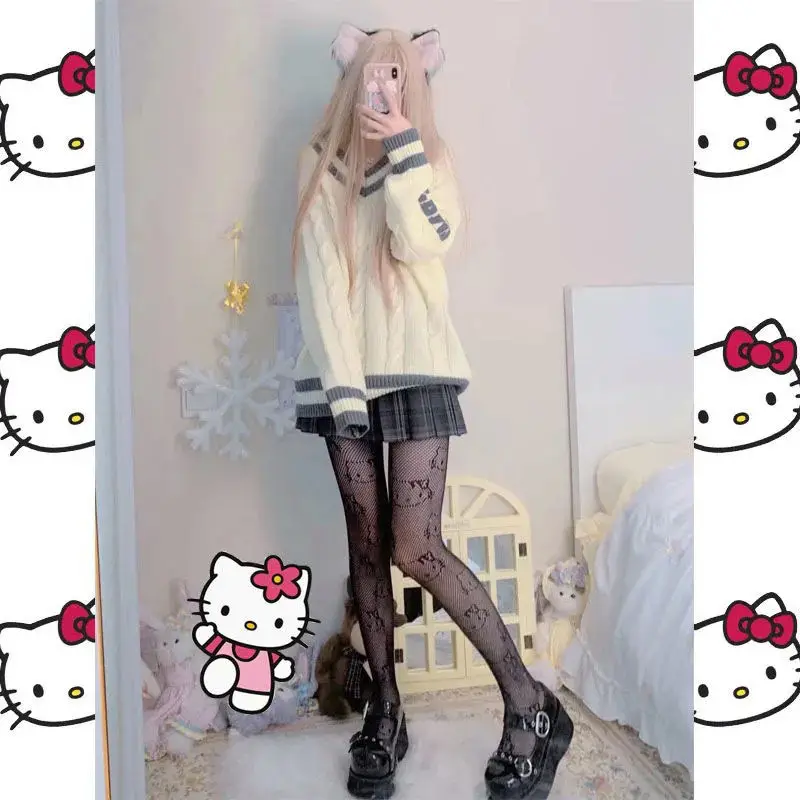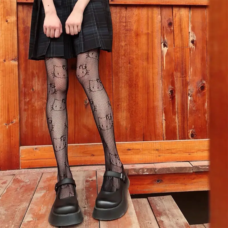 Cute Japanese Hello Kitty Fishing Net Socks Black Silk Stockings Women’s Thin Spring and Autumn Anti-hook Silk Bottom Pantyhose